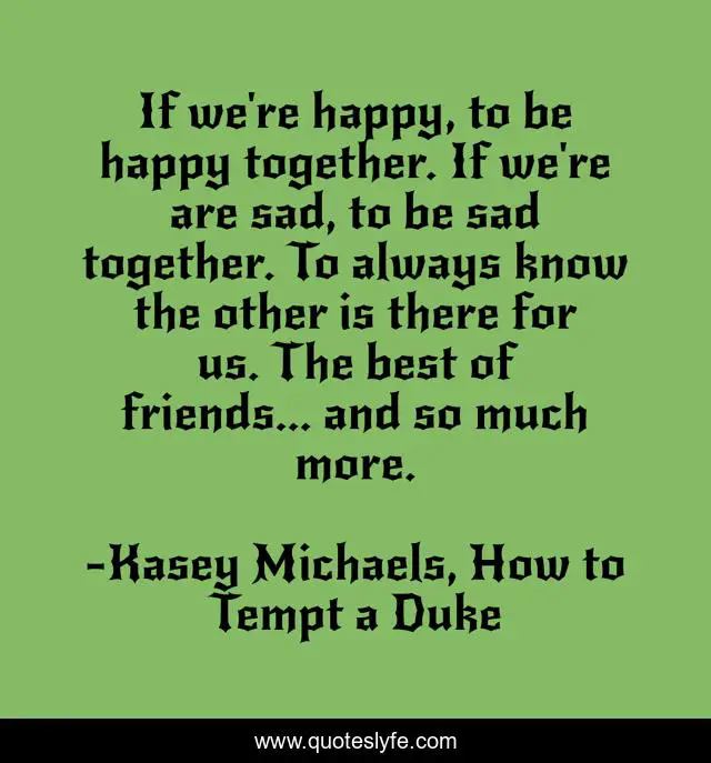 This page presents the quote "If we're happy, to be happy together. If we're are sad, to be sad together. To always know the other is there for us. The best of friends... and so much more.". Author of this quote is Kasey Michaels, How to Tempt a Duke. This quote is about lovers, love, affection,.