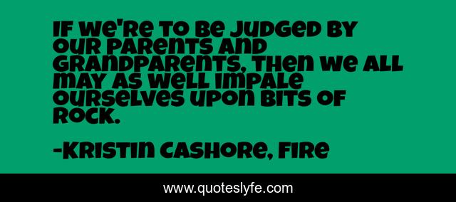This page presents the quote "If we're to be judged by our parents and grandparents, then we all may as well impale ourselves upon bits of rock.". Author of this quote is Kristin Cashore, Fire. This quote is about fire, grandparents, judge, parents, kristin-cashore,.