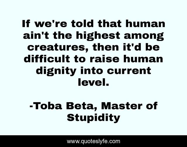 This page presents the quote "If we're told that human ain't the highest among creatures, then it'd be difficult to raise human dignity into current level.". Author of this quote is Toba Beta, Master of Stupidity. This quote is about dignity, lies,.