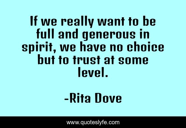 This page presents the quote "If we really want to be full and generous in spirit, we have no choice but to trust at some level.". Author of this quote is Rita Dove. This quote is about spirit, choice,.