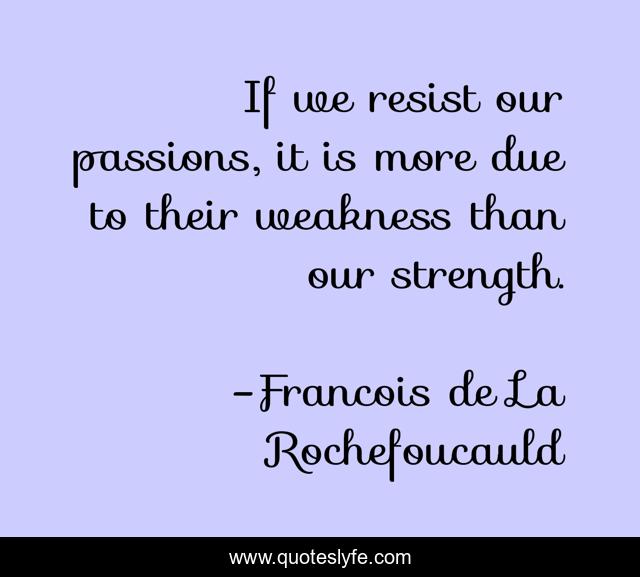 This page presents the quote "If we resist our passions, it is more due to their weakness than our strength.". Author of this quote is Francois de La Rochefoucauld. This quote is about resist, weakness,.