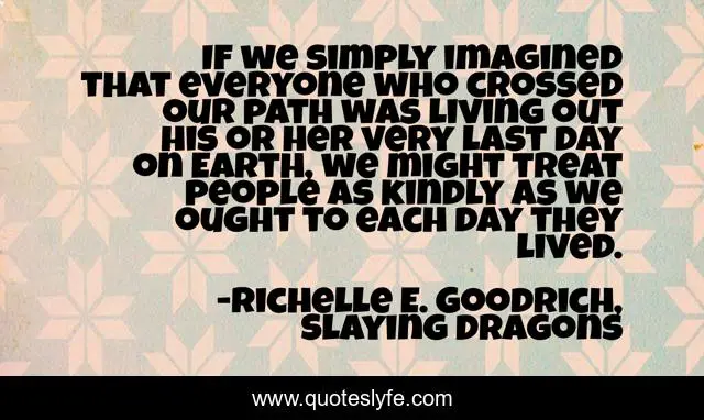 This page presents the quote "If we simply imagined that everyone who crossed our path was living out his or her very last day on Earth, we might treat people as kindly as we ought to each day they lived.". Author of this quote is Richelle E. Goodrich, Slaying Dragons. This quote is about empathy, compassion, richelle-e-goodrich, richelle, consideration, treating-people-kindly, richelle-goodrich, kindness,.