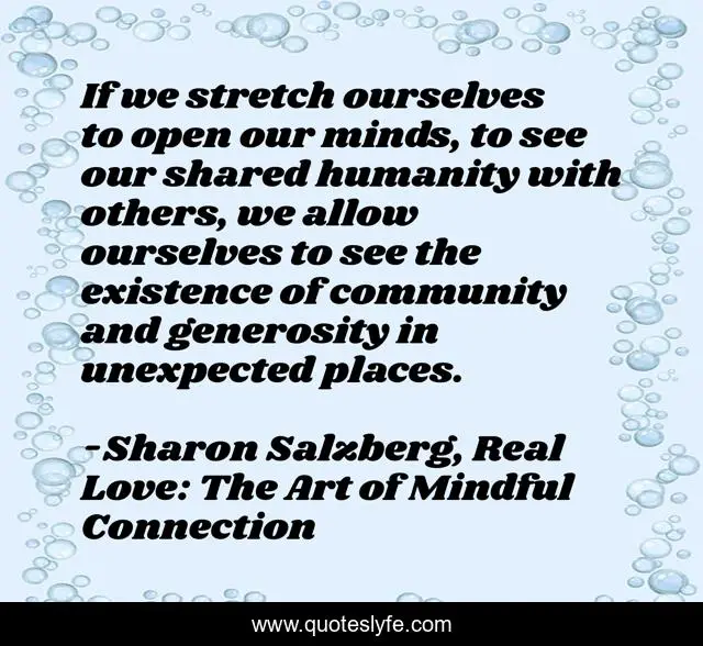 This page presents the quote "If we stretch ourselves to open our minds, to see our shared humanity with others, we allow ourselves to see the existence of community and generosity in unexpected places.". Author of this quote is Sharon Salzberg, Real Love: The Art of Mindful Connection. This quote is about generosity, community, humanity, learning, mindfulness,.