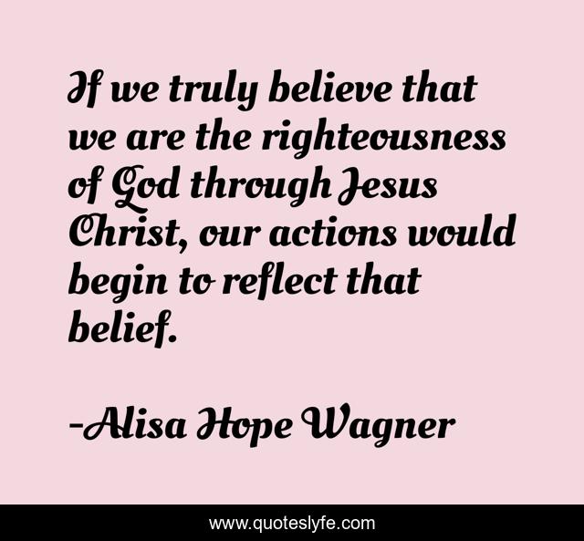 This page presents the quote "If we truly believe that we are the righteousness of God through Jesus Christ, our actions would begin to reflect that belief.". Author of this quote is Alisa Hope Wagner. This quote is about jesus-christ, righteousness, believe,.