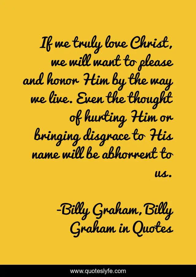 This page presents the quote "If we truly love Christ, we will want to please and honor Him by the way we live. Even the thought of hurting Him or bringing disgrace to His name will be abhorrent to us.". Author of this quote is Billy Graham, Billy Graham in Quotes. This quote is about love, affection, billy-graham,.