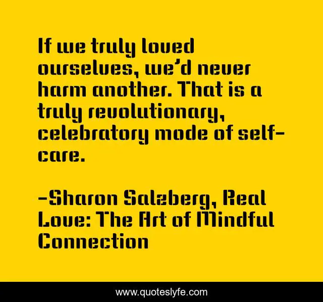 This page presents the quote "If we truly loved ourselves, we’d never harm another. That is a truly revolutionary, celebratory mode of self-care.". Author of this quote is Sharon Salzberg, Real Love: The Art of Mindful Connection. This quote is about revolution, love, mindfulness, mindfulness-practice, meditation, real-love, self-care, affection,.