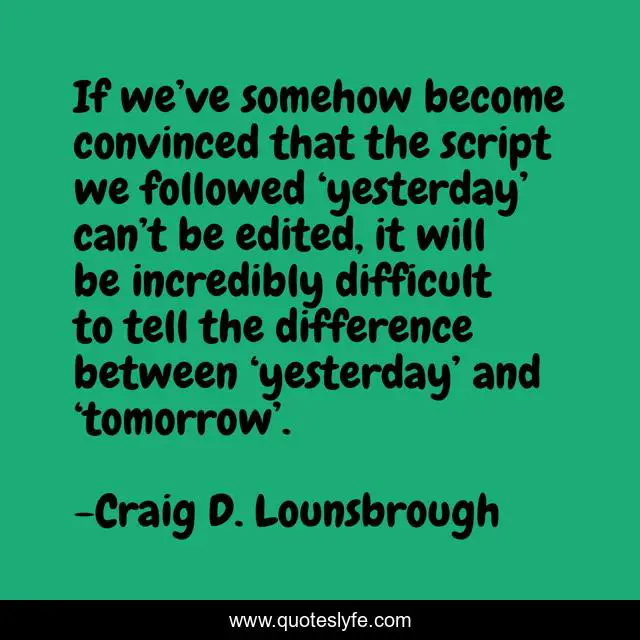This page presents the quote "If we’ve somehow become convinced that the script we followed ‘yesterday’ can’t be edited, it will be incredibly difficult to tell the difference between ‘yesterday’ and ‘tomorrow’.". Author of this quote is Craig D. Lounsbrough. This quote is about new-years, script, yesterday, past, future, new-years-day, tomorrow, difficult,.