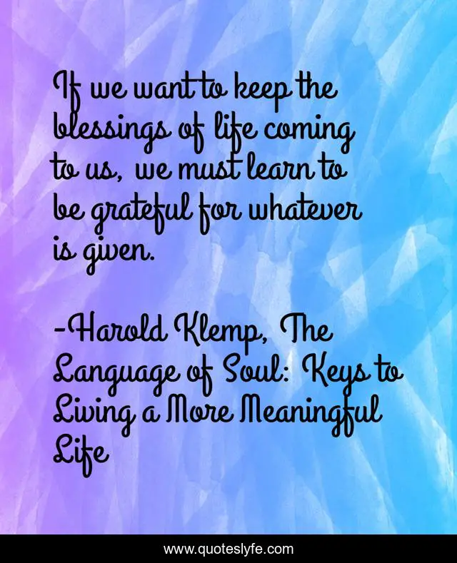 This page presents the quote "If we want to keep the blessings of life coming to us, we must learn to be grateful for whatever is given.". Author of this quote is Harold Klemp, The Language of Soul: Keys to Living a More Meaningful Life. .