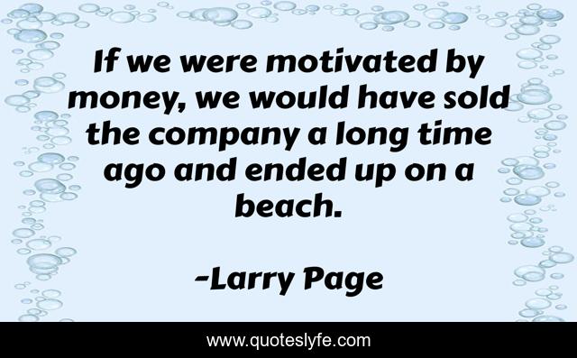 This page presents the quote "If we were motivated by money, we would have sold the company a long time ago and ended up on a beach.". Author of this quote is Larry Page. This quote is about money, company, beach,.