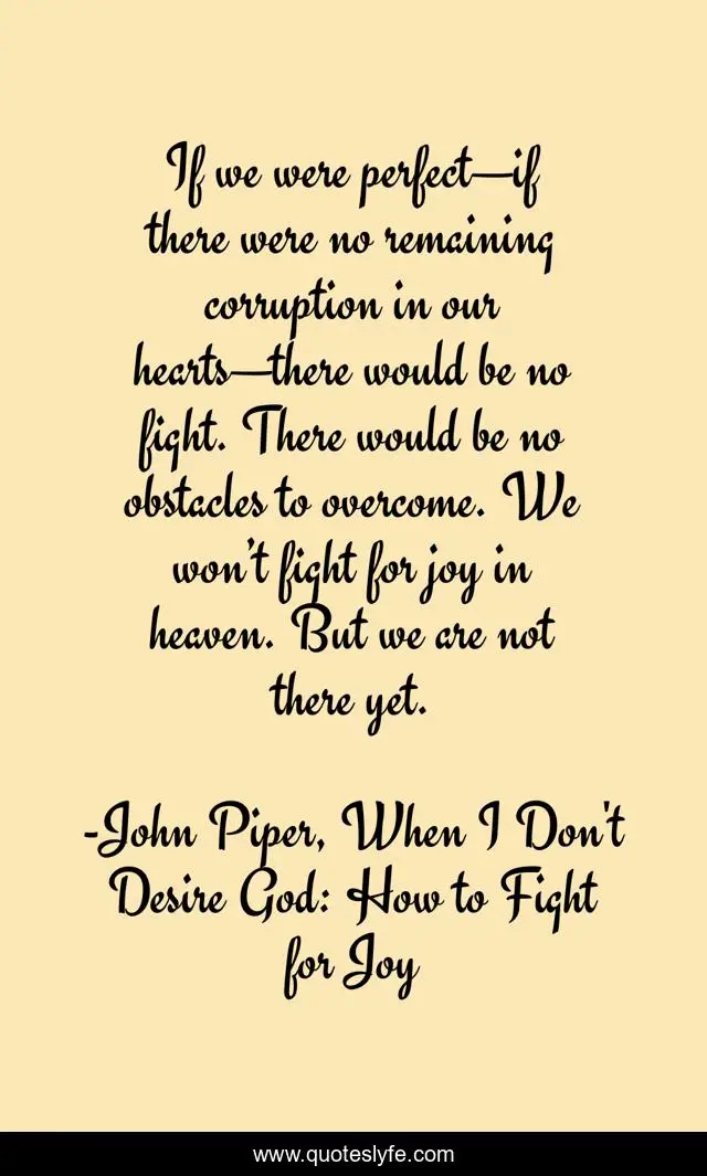 This page presents the quote "If we were perfect—if there were no remaining corruption in our hearts—there would be no fight. There would be no obstacles to overcome. We won’t fight for joy in heaven. But we are not there yet.". Author of this quote is John Piper, When I Don't Desire God: How to Fight for Joy. This quote is about joy, obstacles, fight,.