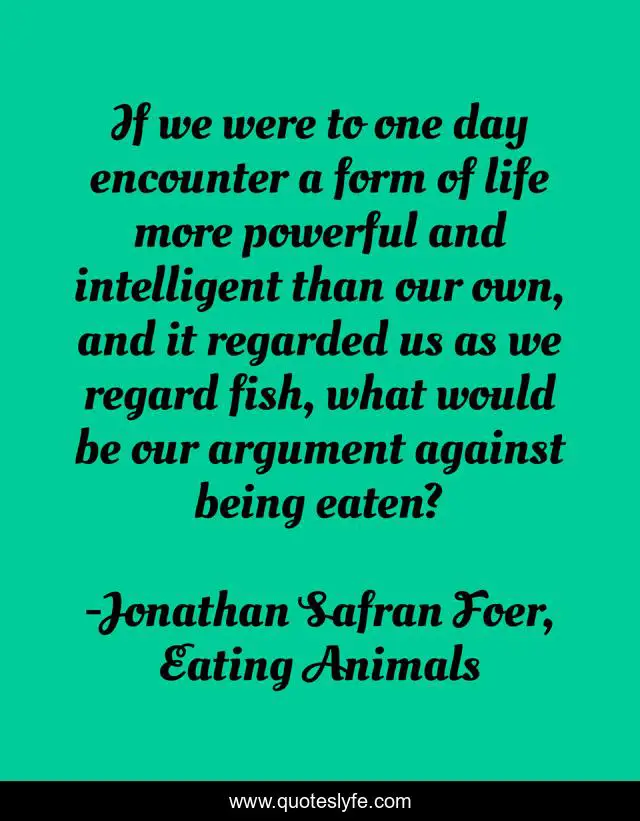 This page presents the quote "If we were to one day encounter a form of life more powerful and intelligent than our own, and it regarded us as we regard fish, what would be our argument against being eaten?". Author of this quote is Jonathan Safran Foer, Eating Animals. This quote is about enthusiasm, life, thought-provoking, inspirational,.