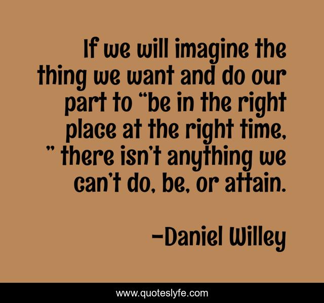 This page presents the quote "If we will imagine the thing we want and do our part to “be in the right place at the right time, ” there isn’t anything we can’t do, be, or attain.". Author of this quote is Daniel Willey. This quote is about be, inspiring, uplifting, right-place, thinking, positive, motivational, confidence, positive-thinking,.