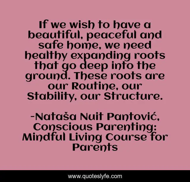 This page presents the quote "If we wish to have a beautiful, peaceful and safe home, we need healthy expanding roots that go deep into the ground. These roots are our Routine, our Stability, our Structure.". Author of this quote is Nataša Nuit Pantović, Conscious Parenting: Mindful Living Course for Parents. This quote is about kids-development, family, parenting-help, mindful-parenting, parenting, conscious-parenting, family-life, spiritual-parenting, family-relationships,.