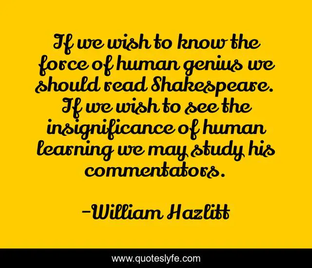 This page presents the quote "If we wish to know the force of human genius we should read Shakespeare. If we wish to see the insignificance of human learning we may study his commentators.". Author of this quote is William Hazlitt. This quote is about scholars, scholarship,.