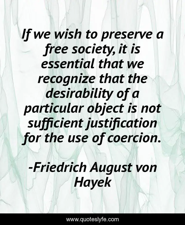 This page presents the quote "If we wish to preserve a free society, it is essential that we recognize that the desirability of a particular object is not sufficient justification for the use of coercion.". Author of this quote is Friedrich August von Hayek. This quote is about free society, wish, free,.