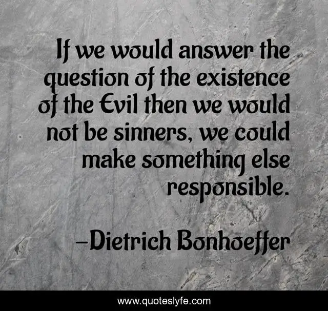 This page presents the quote "If we would answer the question of the existence of the Evil then we would not be sinners, we could make something else responsible.". Author of this quote is Dietrich Bonhoeffer. This quote is about bible, christian, biblical, temptation, god, creation, dietrich, responsible, evil,.