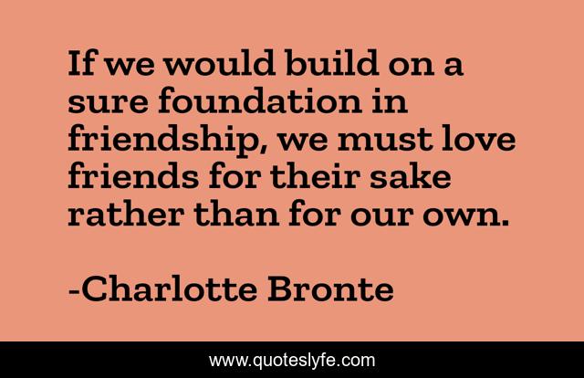 This page presents the quote "If we would build on a sure foundation in friendship, we must love friends for their sake rather than for our own.". Author of this quote is Charlotte Bronte. This quote is about love, friends, affection, foundation,.
