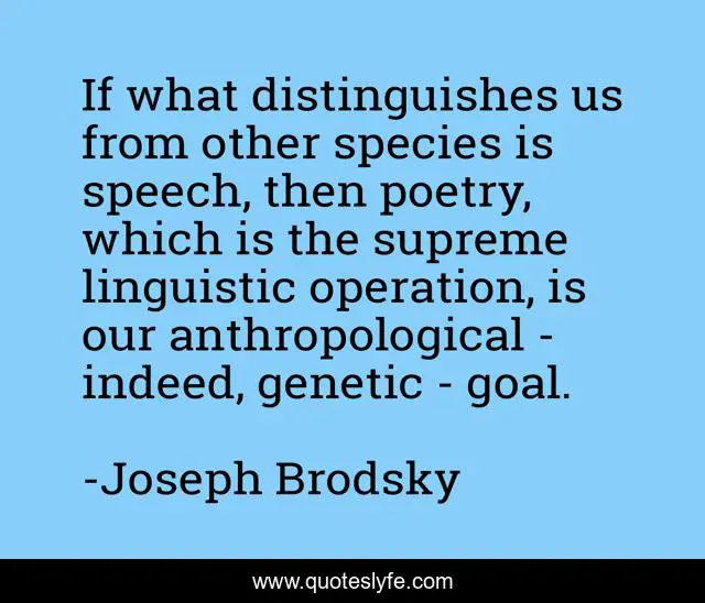This page presents the quote "If what distinguishes us from other species is speech, then poetry, which is the supreme linguistic operation, is our anthropological - indeed, genetic - goal.". Author of this quote is Joseph Brodsky. This quote is about speech, goal, which,.