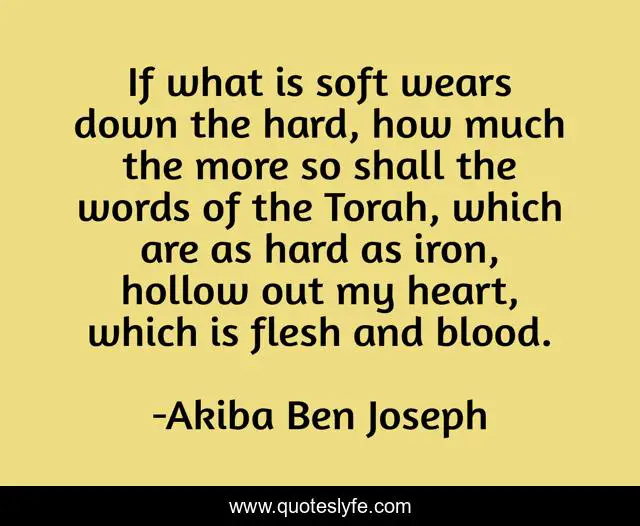 This page presents the quote "If what is soft wears down the hard, how much the more so shall the words of the Torah, which are as hard as iron, hollow out my heart, which is flesh and blood.". Author of this quote is Akiba Ben Joseph. .