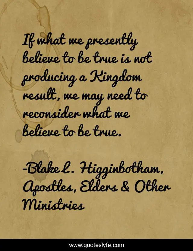 This page presents the quote "If what we presently believe to be true is not producing a Kingdom result, we may need to reconsider what we believe to be true.". Author of this quote is Blake L. Higginbotham, Apostles, Elders & Other Ministries. This quote is about kingdom, faith, belief, truth, revelation,.