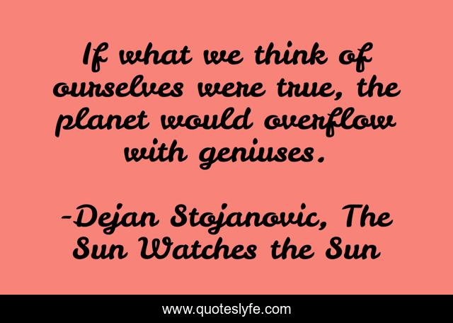 This page presents the quote "If what we think of ourselves were true, the planet would overflow with geniuses.". Author of this quote is Dejan Stojanovic, The Sun Watches the Sun. This quote is about poets, literature, dejan-stojanovic, philosophy, poetry, wisdom, planet, quotes, books,.