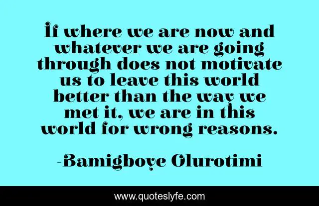 This page presents the quote "If where we are now and whatever we are going through does not motivate us to leave this world better than the way we met it, we are in this world for wrong reasons.". Author of this quote is Bamigboye Olurotimi. This quote is about motivation, right, reasons, creation, invention, technology, best, time-world, crises,.
