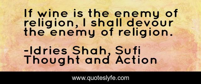 This page presents the quote "If wine is the enemy of religion, I shall devour the enemy of religion.". Author of this quote is Idries Shah, Sufi Thought and Action. This quote is about sufism, sufis, omar-khayyam, wine, wisdom,.