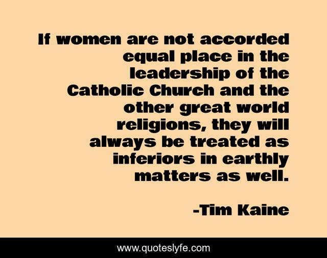 This page presents the quote "If women are not accorded equal place in the leadership of the Catholic Church and the other great world religions, they will always be treated as inferiors in earthly matters as well.". Author of this quote is Tim Kaine. This quote is about world, great, women,.
