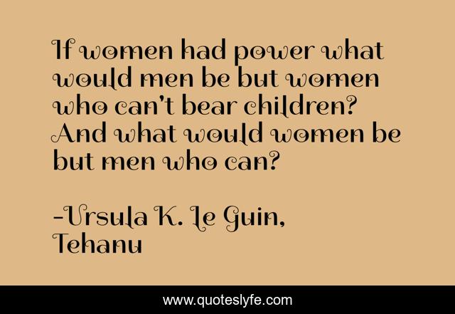 This page presents the quote "If women had power what would men be but women who can't bear children? And what would women be but men who can?". Author of this quote is Ursula K. Le Guin, Tehanu. This quote is about men, power, women,.