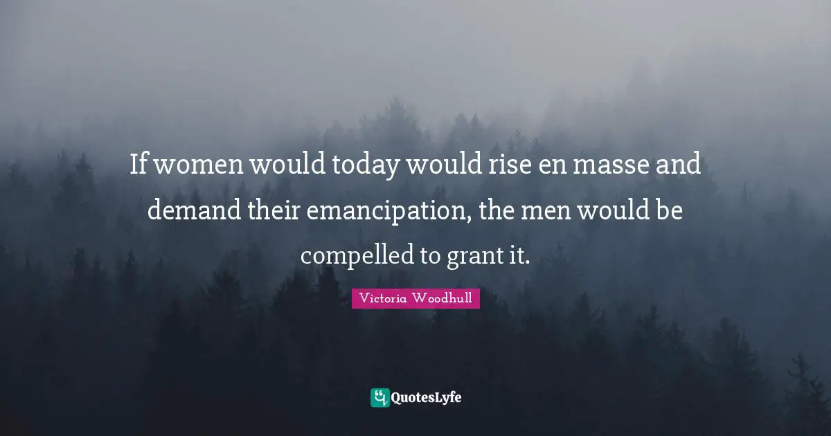 This page presents the quote "If women would today would rise en masse and demand their emancipation, the men would be compelled to grant it.". Author of this quote is Victoria Woodhull. This quote is about today, men, demand, feminist, women, compelled, emancipation, would be,.