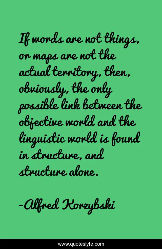 This page presents the quote "If words are not things, or maps are not the actual territory, then, obviously, the only possible link between the objective world and the linguistic world is found in structure, and structure alone.". Author of this quote is Alfred Korzybski. This quote is about world, possible, words,.