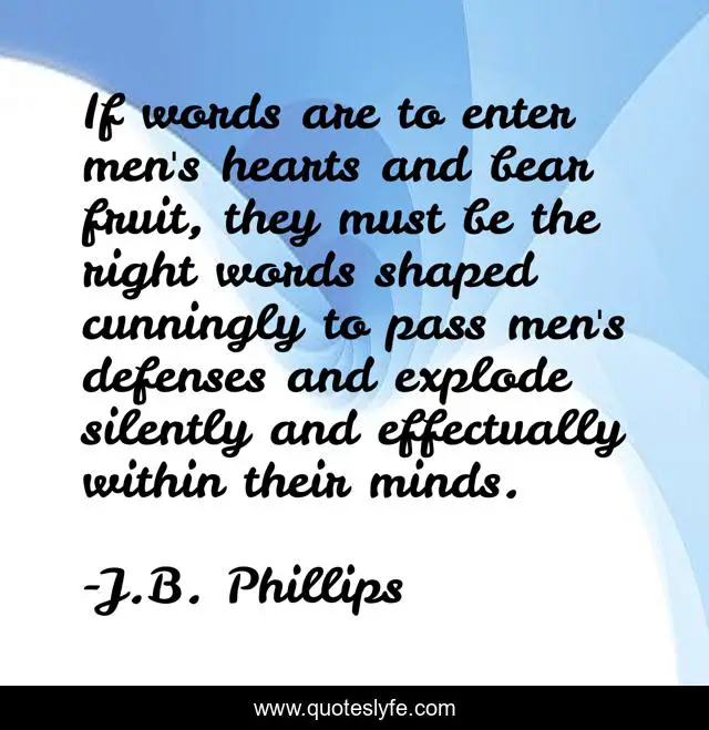 This page presents the quote "If words are to enter men's hearts and bear fruit, they must be the right words shaped cunningly to pass men's defenses and explode silently and effectually within their minds.". Author of this quote is J.B. Phillips. This quote is about silently, effectually, words, defenses,.