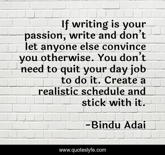 This page presents the quote "If writing is your passion, write and don’t let anyone else convince you otherwise. You don’t need to quit your day job to do it. Create a realistic schedule and stick with it.". Author of this quote is Bindu Adai. This quote is about enthusiasm, passion, inspirational, writing,.