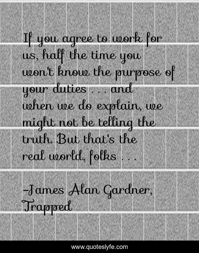 This page presents the quote "If you agree to work for us, half the time you won't know the purpose of your duties . . . and when we do explain, we might not be telling the truth. But that's the real world, folks . . .". Author of this quote is James Alan Gardner, Trapped. This quote is about industry, work, espionage,.