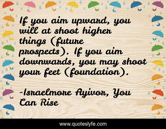 This page presents the quote "If you aim upward, you will at shoot higher things (future prospects). If you aim downwards, you may shoot your feet (foundation).". Author of this quote is Israelmore Ayivor, You Can Rise. This quote is about high, you-can-rise, think-ahead, goal-setting, food-for-thought, future-prospects, downwards, aim-high, israelmore-ayivor,.