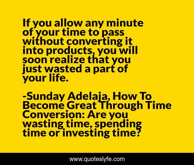 This page presents the quote "If you allow any minute of your time to pass without converting it into products, you will soon realize that you just wasted a part of your life.". Author of this quote is Sunday Adelaja, How To Become Great Through Time Conversion: Are you wasting time, spending time or investing time?. This quote is about time-management, product, conversion, productivity, wealth, greatness, waste, humanity, life,.