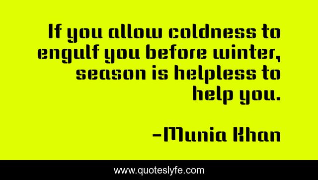 This page presents the quote "If you allow coldness to engulf you before winter, season is helpless to help you.". Author of this quote is Munia Khan. This quote is about winter, cold-days, season, wisdom, coldness, engulf, allow, seasons, cold,.