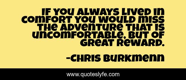This page presents the quote "If you always lived in comfort you would miss the adventure that is uncomfortable, but of great reward.". Author of this quote is Chris Burkmenn. This quote is about faith, god, work, jesus, live, dreams, believe, achieve, goals,.