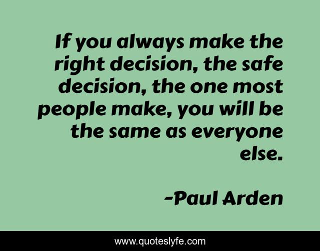 This page presents the quote "If you always make the right decision, the safe decision, the one most people make, you will be the same as everyone else.". Author of this quote is Paul Arden. .