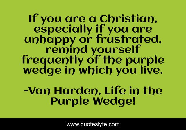 This page presents the quote "If you are a Christian, especially if you are unhappy or frustrated, remind yourself frequently of the purple wedge in which you live.". Author of this quote is Van Harden, Life in the Purple Wedge!. .