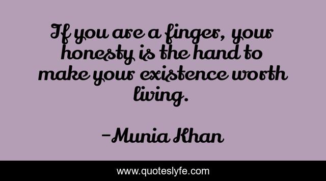 This page presents the quote "If you are a finger, your honesty is the hand to make your existence worth living.". Author of this quote is Munia Khan. This quote is about living, wise-words, honesty, wisdom-wise, make, fingers, wisdom, finger, existence,.