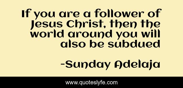 This page presents the quote "If you are a follower of Jesus Christ, then the world around you will also be subdued". Author of this quote is Sunday Adelaja. This quote is about world, follower, subdued, christ, jesus,.