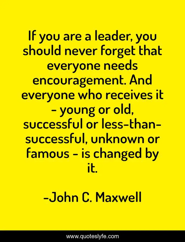 This page presents the quote "If you are a leader, you should never forget that everyone needs encouragement. And everyone who receives it - young or old, successful or less-than-successful, unknown or famous - is changed by it.". Author of this quote is John C. Maxwell. This quote is about leader, encouragement,.