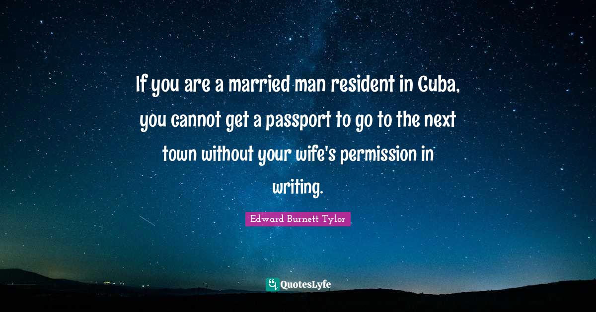 This page presents the quote "If you are a married man resident in Cuba, you cannot get a passport to go to the next town without your wife's permission in writing.". Author of this quote is Edward Burnett Tylor. This quote is about next, writing, wife, men, cuba, permission, married,.