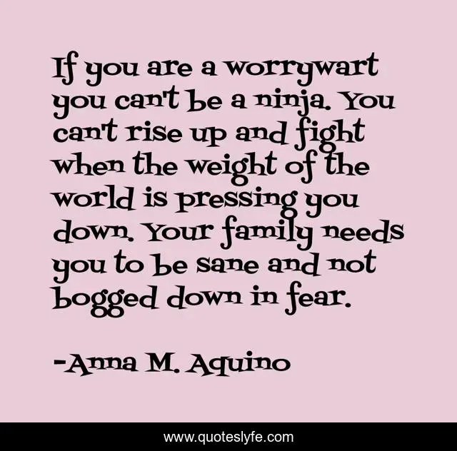 This page presents the quote "If you are a worrywart you can't be a ninja. You can't rise up and fight when the weight of the world is pressing you down. Your family needs you to be sane and not bogged down in fear.". Author of this quote is Anna M. Aquino. This quote is about anna-aquino, momisms, raising-children, parenting, training-manual, ninja-mom, mom, confessions-of-a-ninja-mom,.
