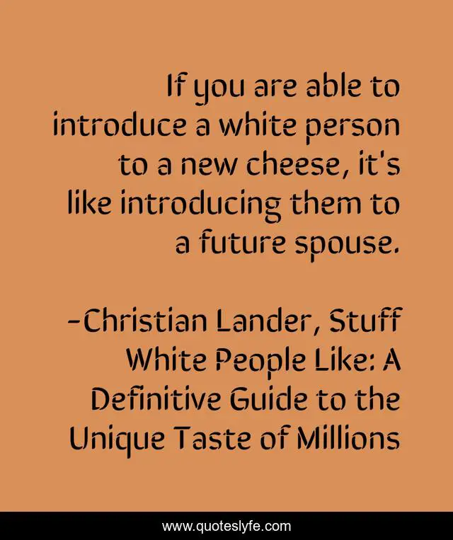 This page presents the quote "If you are able to introduce a white person to a new cheese, it's like introducing them to a future spouse.". Author of this quote is Christian Lander, Stuff White People Like: A Definitive Guide to the Unique Taste of Millions. This quote is about food, cheese, humor, white-people,.