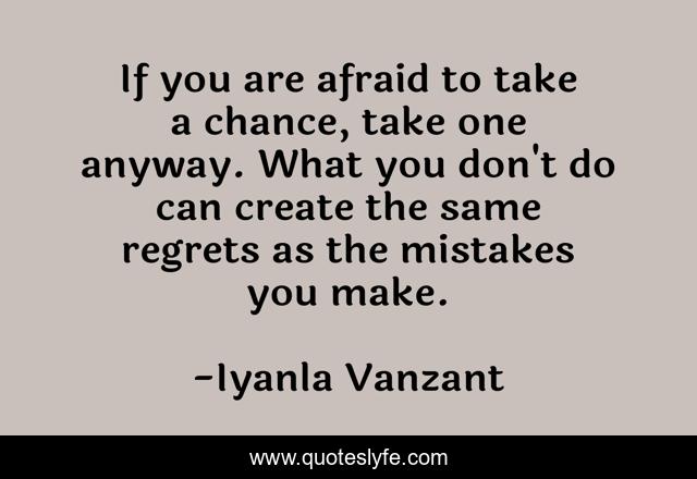 This page presents the quote "If you are afraid to take a chance, take one anyway. What you don't do can create the same regrets as the mistakes you make.". Author of this quote is Iyanla Vanzant. This quote is about regret, chance, mistakes, fear, risk,.