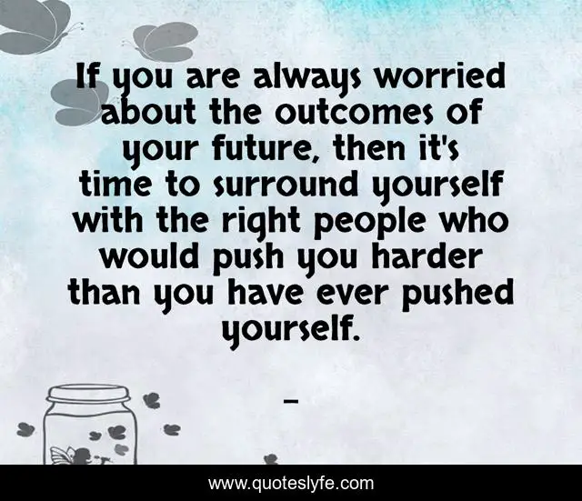 This page presents the quote "If you are always worried about the outcomes of your future, then it's time to surround yourself with the right people who would push you harder than you have ever pushed yourself.". Author of this quote is . This quote is about edmond-mbiaka, the-future-outcmes-of-your-life, worrying-about-the-future, worried-about-the-future, the-outcomes-of-the-future,.