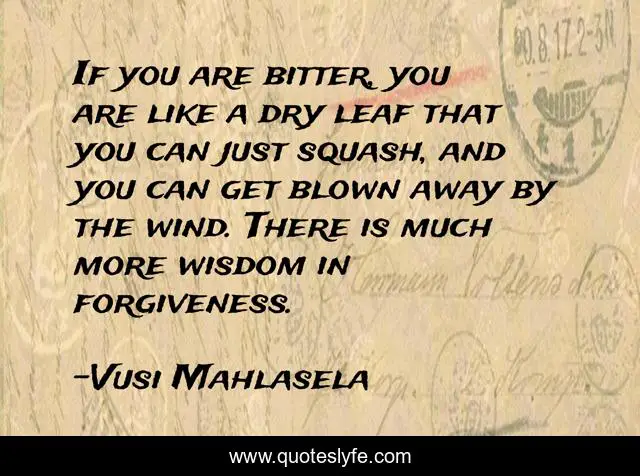 This page presents the quote "If you are bitter, you are like a dry leaf that you can just squash, and you can get blown away by the wind. There is much more wisdom in forgiveness.". Author of this quote is Vusi Mahlasela. This quote is about leaf, wind, wisdom,.