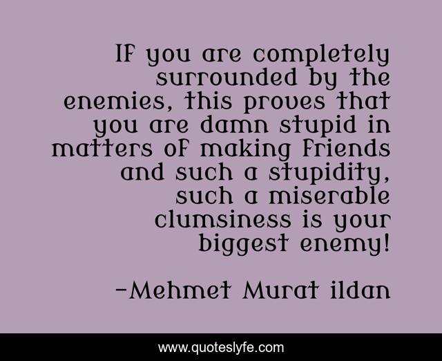This page presents the quote "If you are completely surrounded by the enemies, this proves that you are damn stupid in matters of making friends and such a stupidity, such a miserable clumsiness is your biggest enemy!". Author of this quote is Mehmet Murat ildan. This quote is about enemy, making-friends, murat-ildan, stupidity, stupid, clumsiness, friends, enemies,.